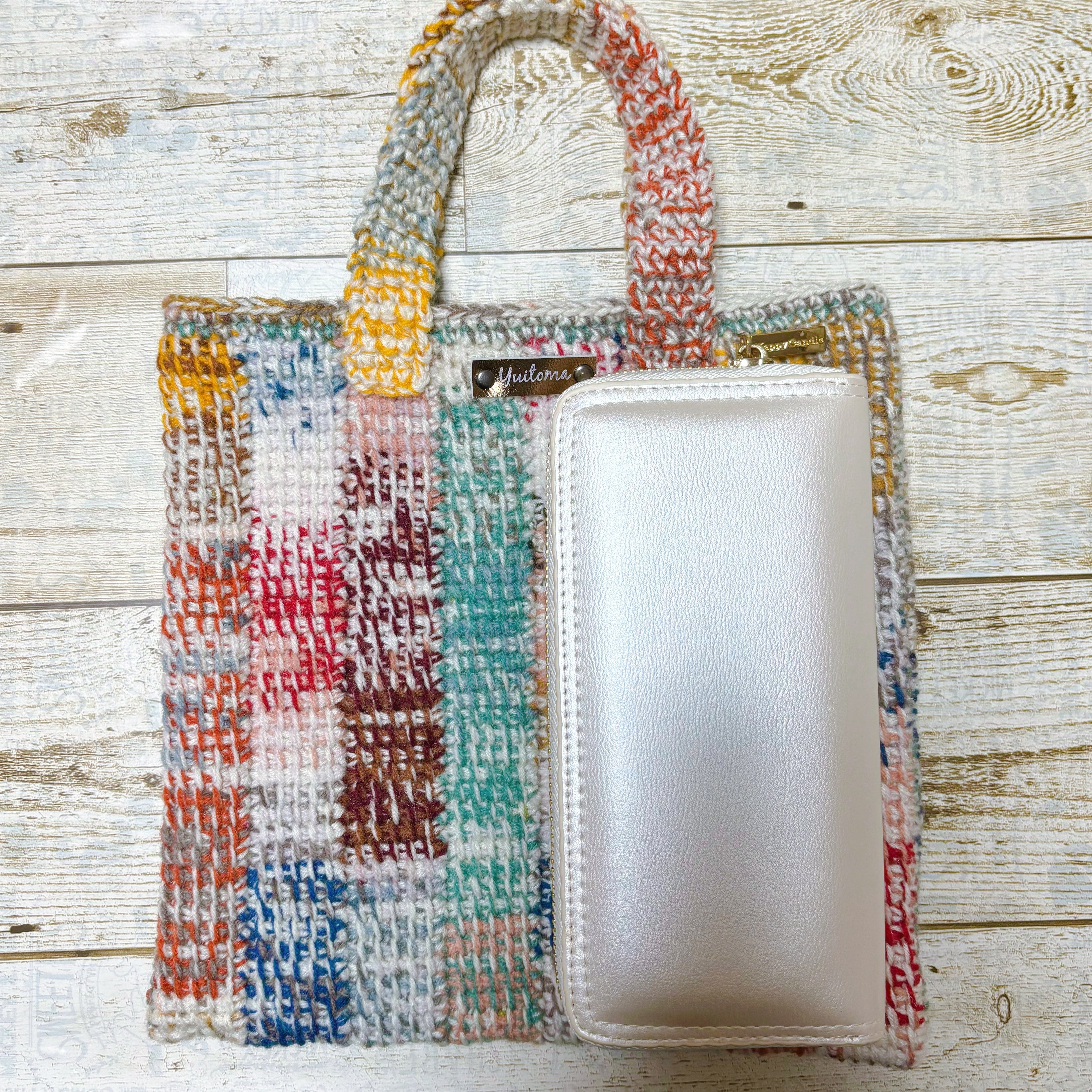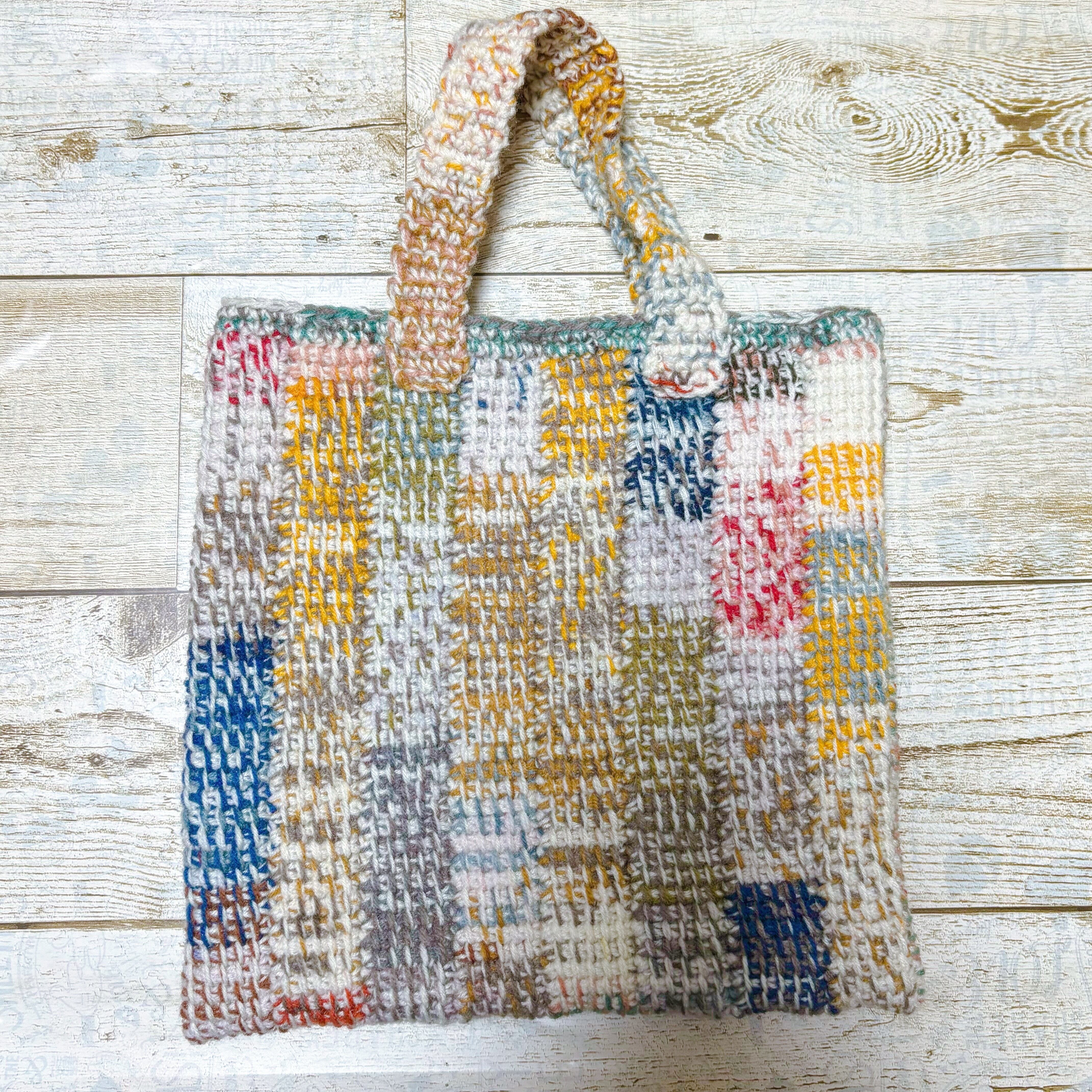 ポストカード4色を合わせてアフガン編みで編んだペタンコバッグです。