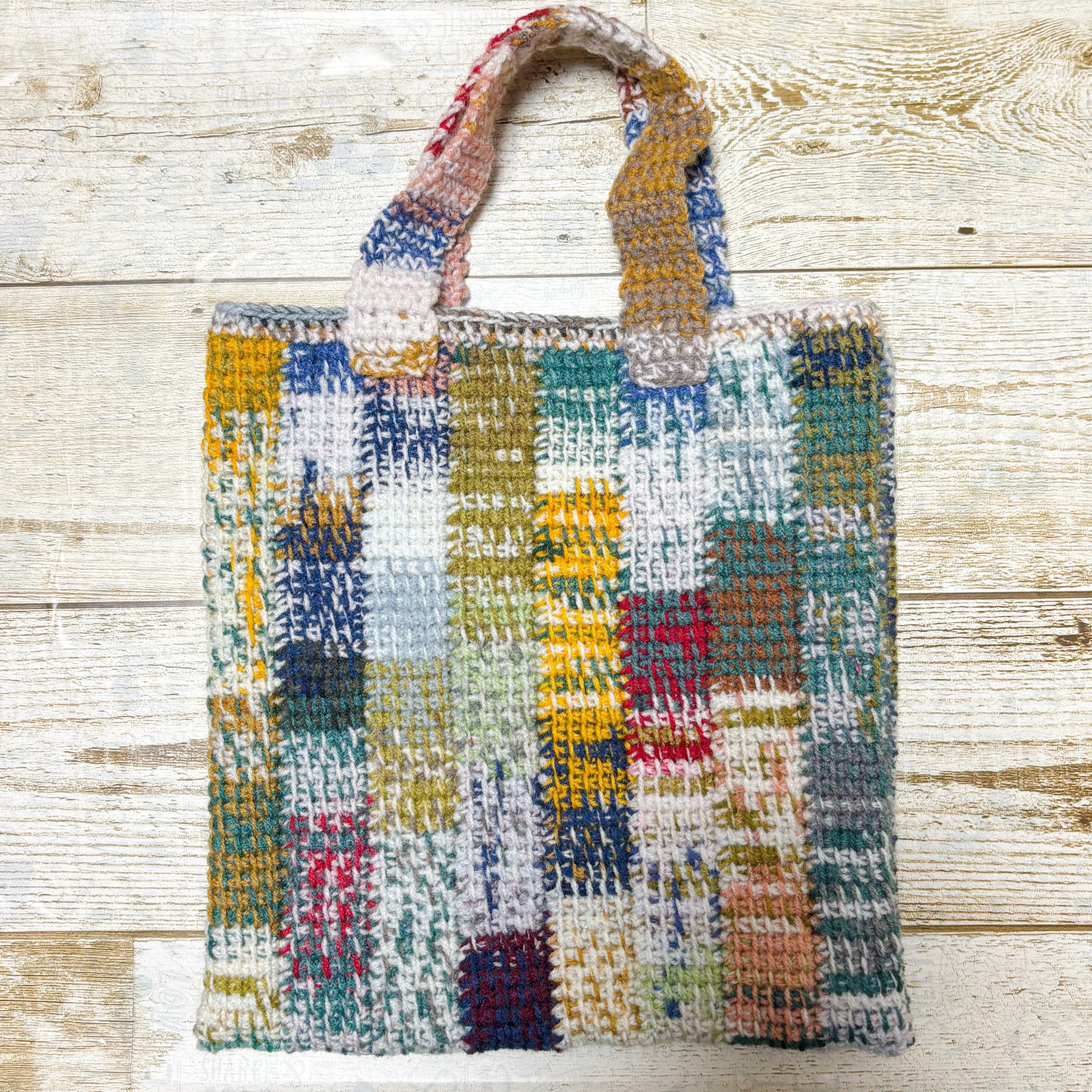 ポストカード5色を合わせてアフガン編みで編んだペタンコバッグです。